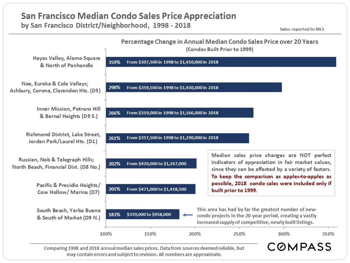 You’ll notice that in 2012, the median price of SFRs and condos was approximately the same. In 2018, SFR prices averaged about 33% higher than condos—and that delta is continuing to spread. Why? The most likely explanation is that the great majority of new housing units coming on the market are condos. This means SFRs are becoming comparatively scarce, but demand is probably not waning, so it’s a simple supply and demand equation. The big takeaway here is that, if you are really interested in buying a single-family home in San Francisco, you might want to act. As long as that delta continues to spread, you lose buying power.